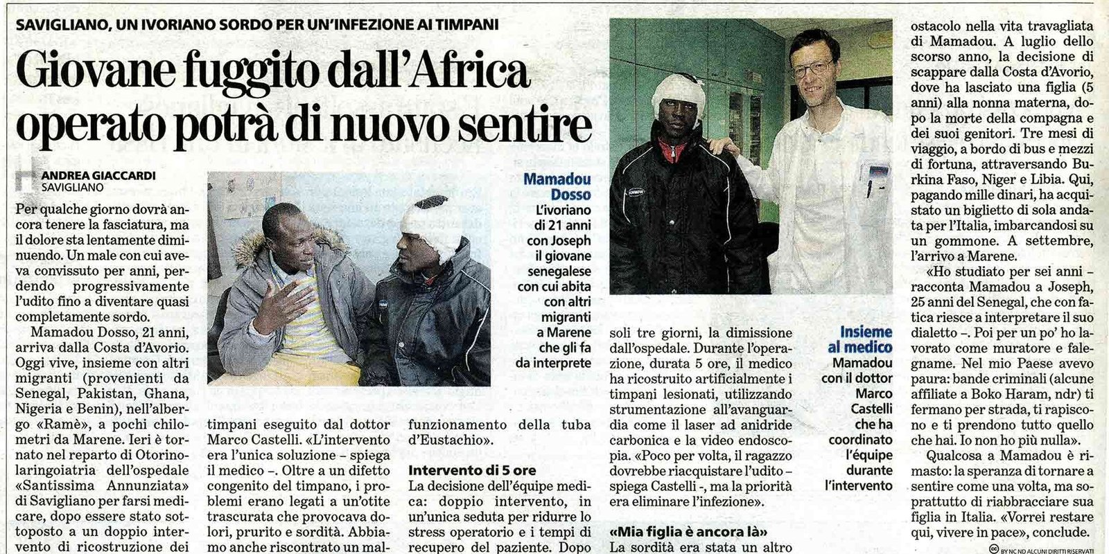 Mamadou Dosso, 21 anni, arriva dalla Costa d’Avorio. Oggi vive, insieme conaltri migranti (provenienti da Senegal, Pakistan, Ghana, Nigeria e Benin), nell’alber- go «Ramè», a pochi chilometri da Marene. Ieri è tornato nel reparto di Otorinolaringoiatria dell’ospedale «Santissima Annunziata» di Savigliano per farsi medicare, dopo essere stato sottoposto a un doppio intervento di ricostruzione dei timpani eseguito dal dottor Marco Castelli. «L’intervento era l’unica soluzione – spiega il medico -. Oltre a un difetto congenito del timpano, i problemi erano legati a un’otite trascurata che provocava dolori, prurito e sordità. Abbiamo anche riscontrato un malfunzionamento della tuba d’Eustachio».