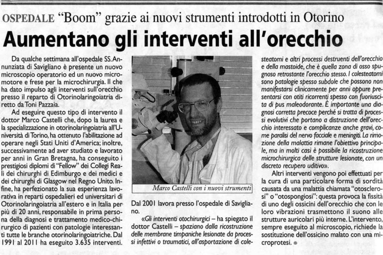 Da qualche settimana all’ospedale SS.Annunziata di Savigliano è presente un nuovo microscopio operatorio ed un nuovo micromotore e frese per la microchirurgia. Il che ha dato impulso agli interventi sull’orecchio…
